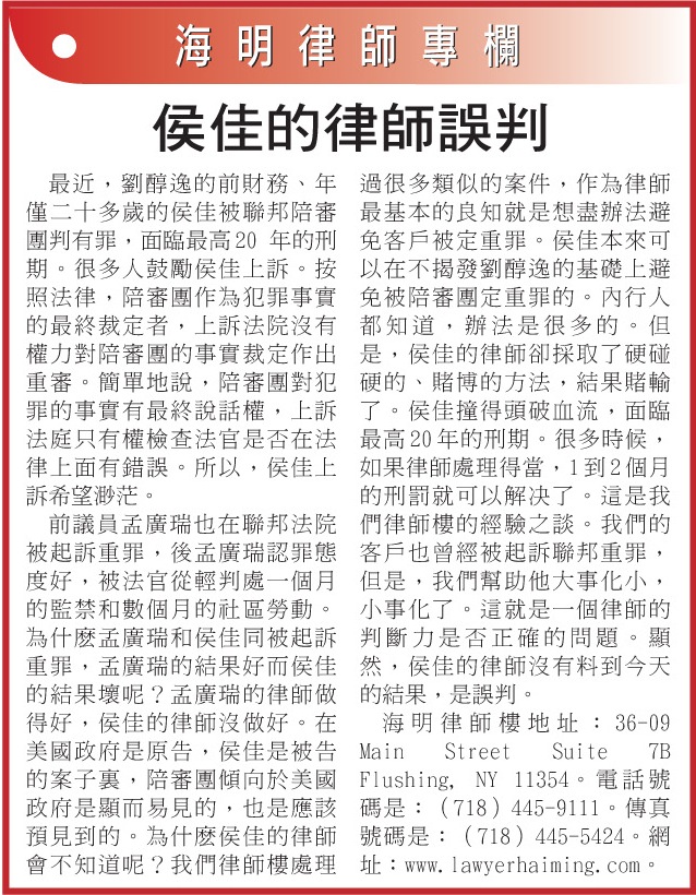 • “明报”,"侨报" 系列,每周刊出, 读者最爱-----海明律师专栏