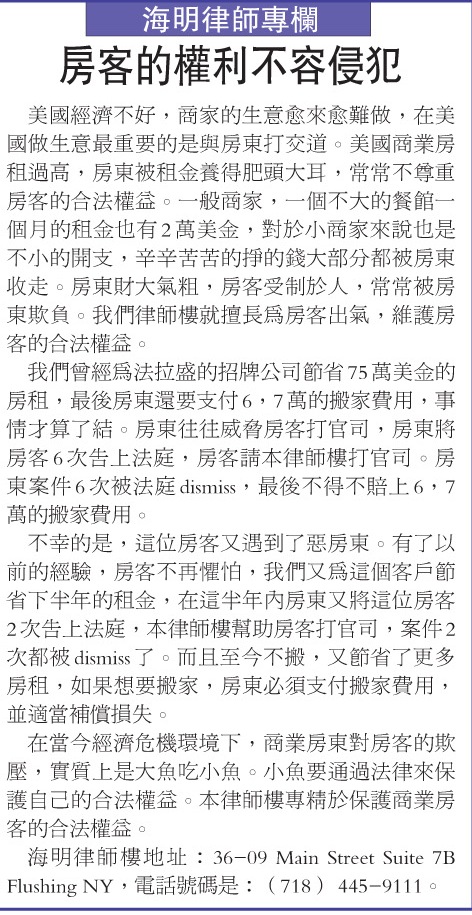 • “明报”,"侨报" 系列,每周刊出, 读者最爱-----海明律师专栏