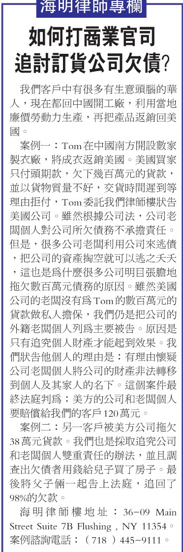 • “明报”,"侨报" 系列,每周刊出, 读者最爱-----海明律师专栏